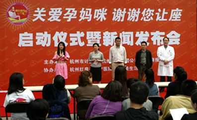 5月16日启动仪式上,杭州公交集团公司宣布,在全市的公交车上全面推行孕妇识别系统--让准妈妈们佩戴一个具有特殊含义的“孕妇徽章”,让别人一眼就能识别孕妇身份,及时给予帮助和照顾。