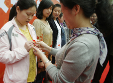 周霞怀孕13周,昨天一大早就从富阳赶到杭州进行孕期检查,中午检查完后和老公在龙翔桥吃了中饭,准备搭乘514路公交车回家。她在龙翔公交站一眼就看到了孕妇徽章的宣传LOGO。由于害羞她不敢走到宣传台,周霞老公就先行过来打探。在得知现场就能免费领取“孕妇徽章”后,周霞老公兴奋地大喊“老婆,过来过来……”工作人员向他们递上“孕妇徽章”,周霞马上就让老公给自己别上。